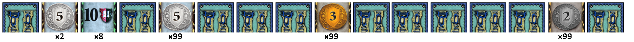 This strategy will buy Silver, Gold, and Platinum until the piles are depleted (indicated by the x99). The other cards can be any supply cards from the pile, although each slot has a restriction over the range of prices allowed. For example, the last menu slot cannot cost more than 2, because it will always be ignored in favor of Silver.