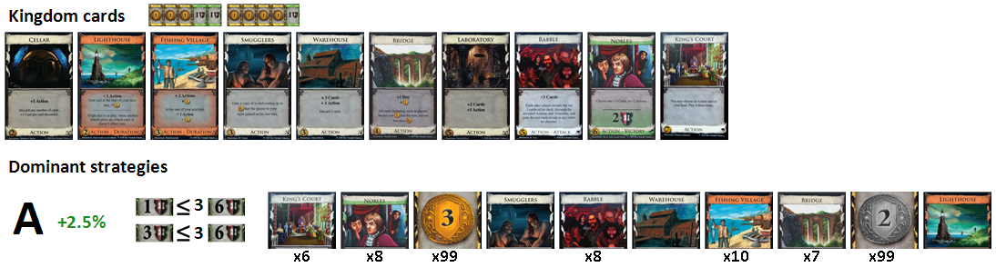 A natural question to ask is what is the ratio of complex to simple kingdoms. It turns out that complex kingdoms are definitely the exception and the vast majority of kingdoms are simple, converging directly to a very good strategy in a small number of iterations. Out of a thousand kingdoms, I was only able to find about five with non-dominating behavior. Note that just because the progression curve typically has simple behavior does not mean that only one strategy is viable. It's sometimes the case that there are multiple leading strategies that use very different cards but are approximately evenly matched against each other. In this case, a player picking any one of the leading strategies is likely to do well.
