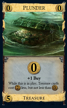 We can also use Provincial to estimate parameters for cards that have not yet been printed, and can look at modifying any parameter, not just a card's cost. Consider the (hypothetical) Plunder card shown above. We perform the same experiment as with Wharf, and find that as depicted above Plunder is only chosen in 3 out of 30 kingdoms. After playing around with the card, I decided that the main reason for this weakness was that it provides 0 money, so is both detrimental when trying to purchase Victory cards and requires very lucky hands to help buy Treasures, since it must be accompanied by other high-value treasures. To strengthen the card, I modified it to more closely mimic Quarry and provide 1 coin when played instead of 0 coins. Rerunning the experiment, Plunder was chosen in 10 out of 30 kingdoms. While still not nearly as strong as Wharf, it is a considerably more viable card and competitive with many other 5-cost cards. Plunder was found to be especially powerful when other good treasures were present, such as Venture: