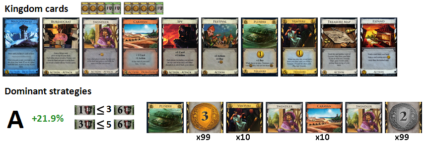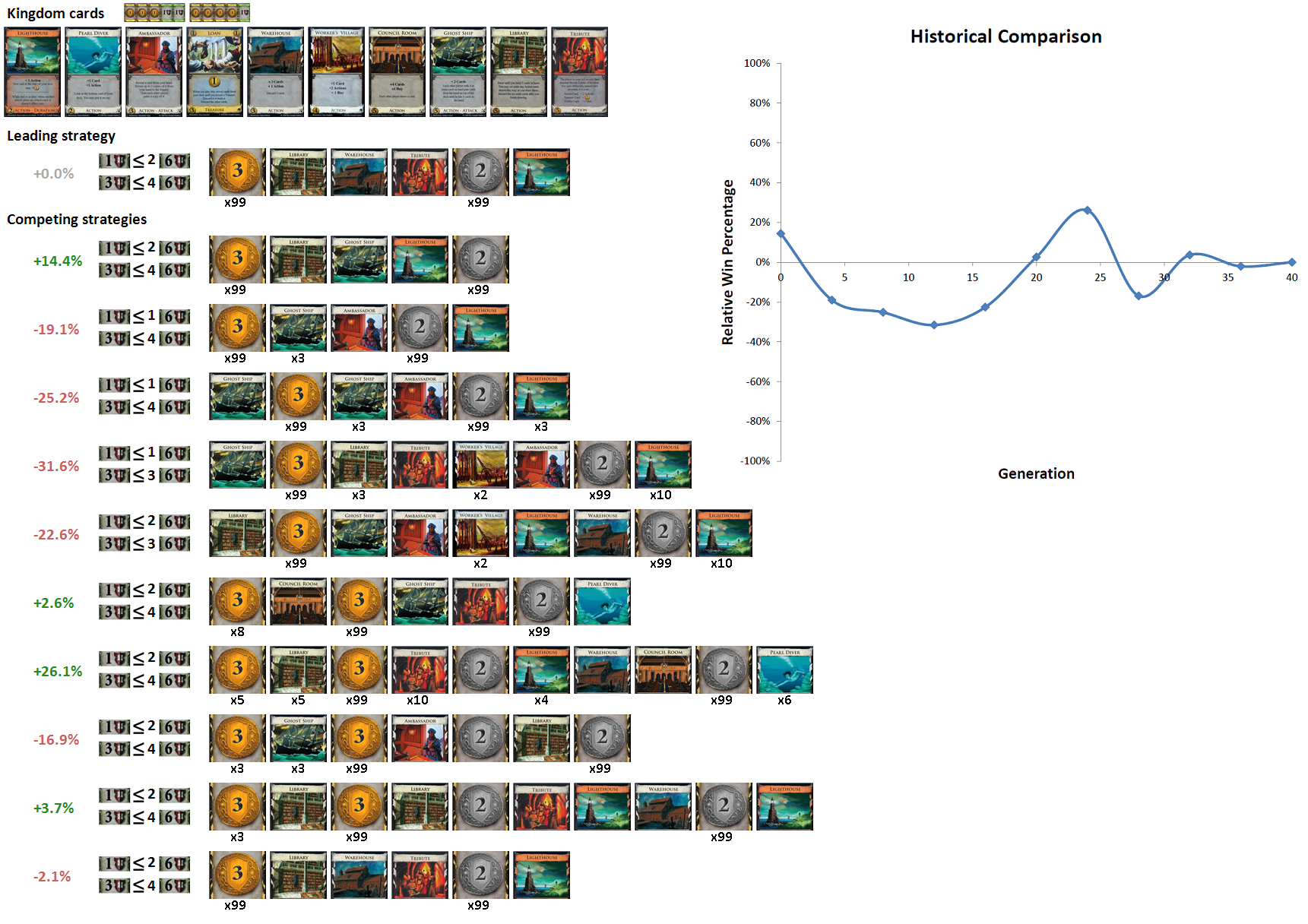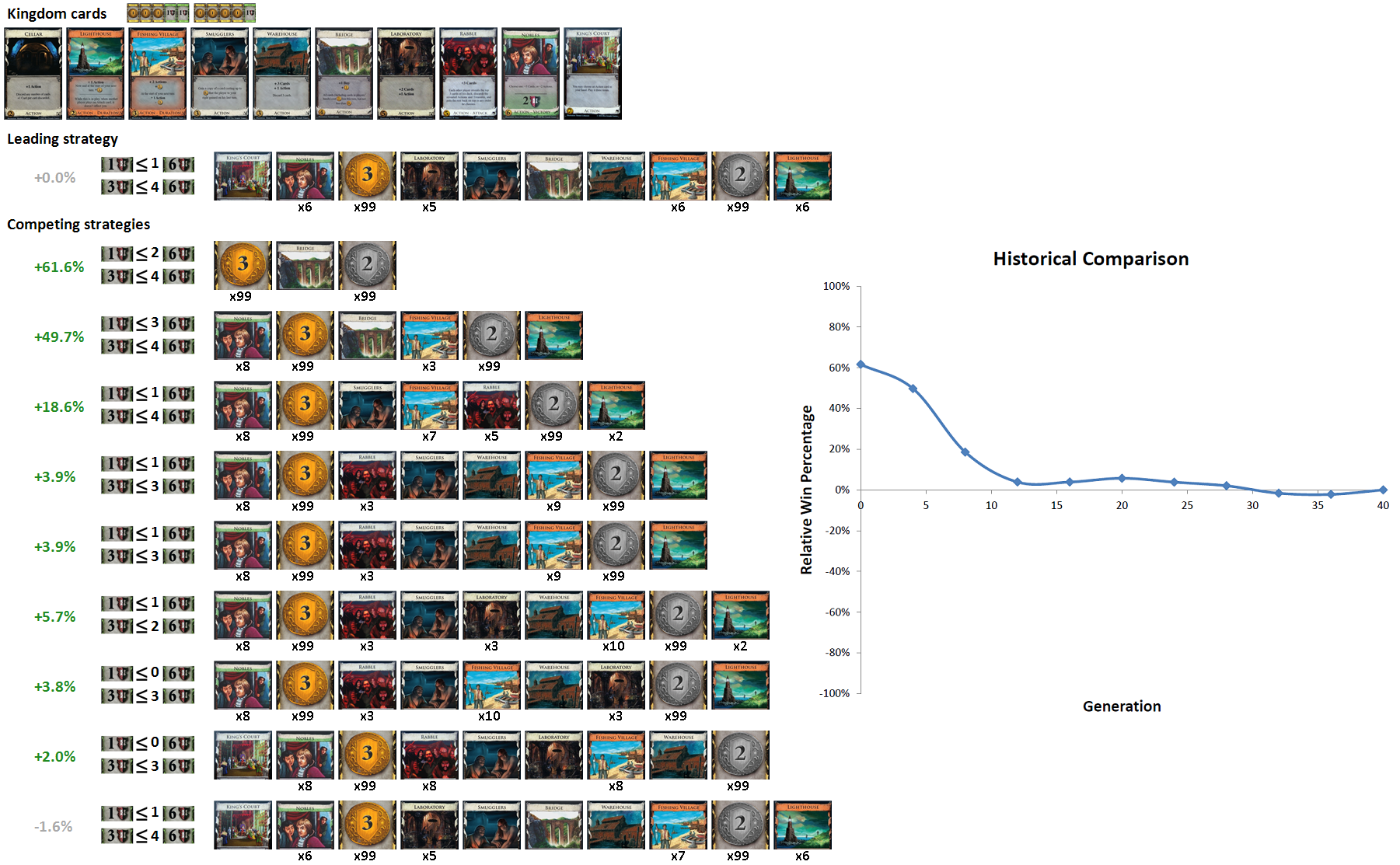 Provincial is a Dominion AI I wrote that attempts to strike a balance between academic value, effective play, and general usability. When designing it, my primary goal was to produce results that are useful to experienced Dominion players. To accomplish this, the AI needs to be parameterized in a way that can be easily understood by humans — techniques such as neural networks and support vector machines, although they can be very effective at machine learning tasks, are effectively black boxes whose internal behavior are challenging for even machine learning experts to understand. To be useful to skilled players, the AI also needs to be able to compete at a high level of play, and produce results in a reasonable amount of time. The core of Provincial is a very aggressive strategiziation framework based on competitive coevolution that takes a given kingdom and runs millions of games against itself, producing an evolving list of dominant strategies. A tournament is then run between all the leading strategies and the results visualized to the user (see below for several examples). Here is a summary of some of Provincial's key features: