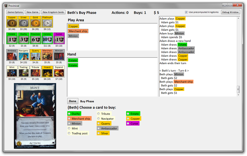 - Online accessibility — Because Provincial's core buy strategy is just an ordered list of card-integer pairs, it is fairly easy to hook up to other play systems. On Isotropic, Provincial is already very competitive and wins well over half its games even at a high level of play, although it does suffer from the initial latency of needing to pause for two minutes while it runs simulations. Unsurprisingly, Provincial can also (trivially) destroy the AI currently used by Goko's dominion implementation, and it would be fairly straightforward to have Provincial's buy strategies replace the ad-hoc buy strategy used by Goko's AI.