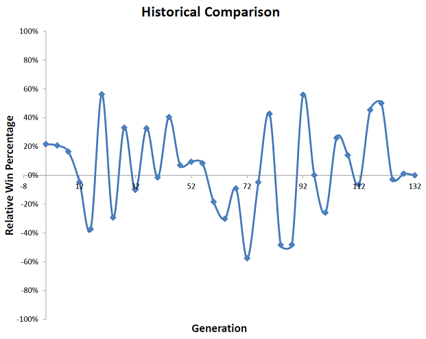 Here, the behavior is much more volatile than the slow and steady improvement seen in a simple kingdom. The leading strategy at generation 40 is substantially better than some prior leaders, but substantially worse than others. These kingdoms are often more interesting to play because the best strategy to choose is much less clear. Even if the AI is allowed to train for many generations, this periodic behavior continues. Here is the same plot, comparing the leader at generation 132 against all prior generations: