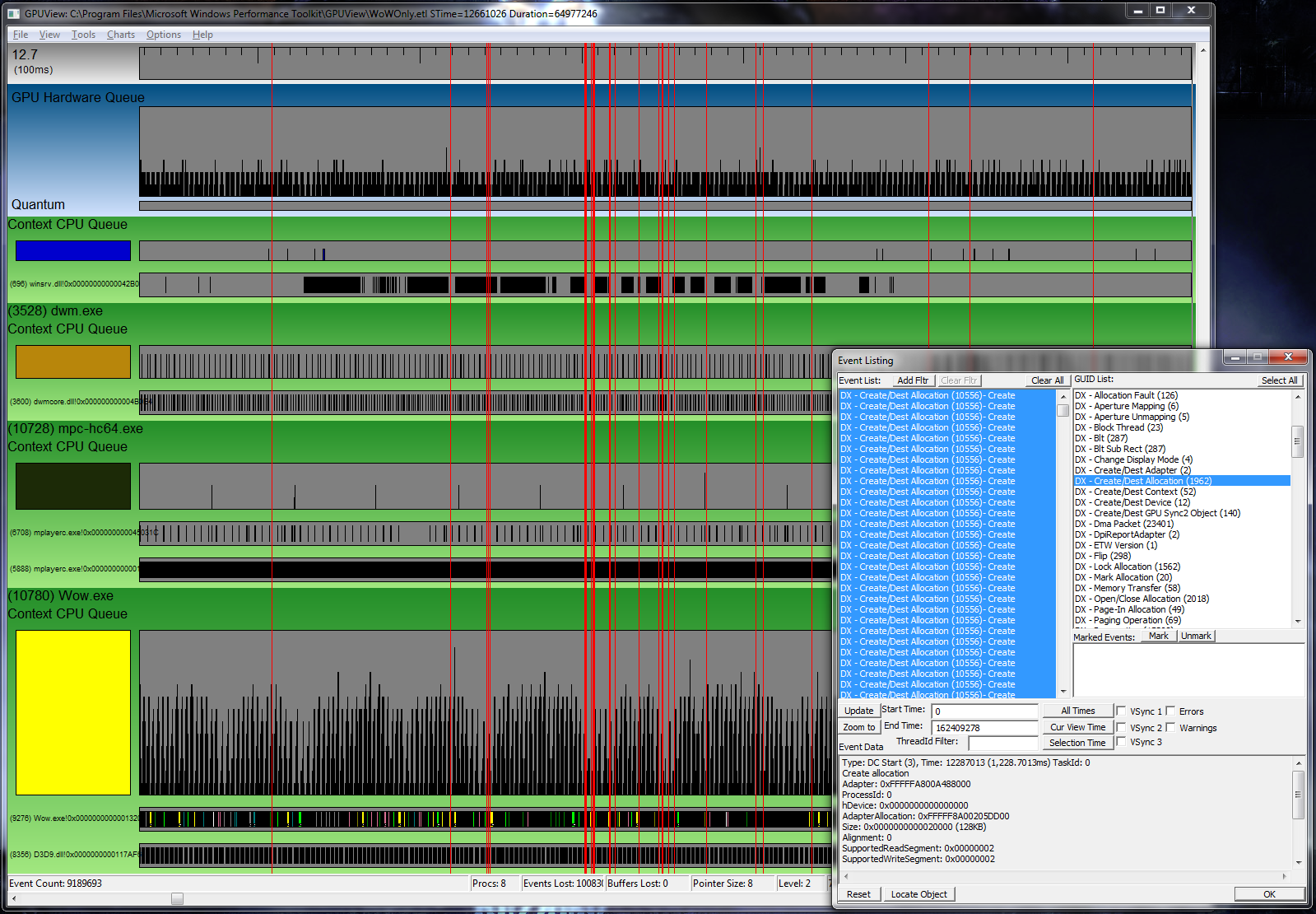 GPUView logs a massive number of events per second. While a lot of these (such as context switches and queue packet submission events) are aggregated into a visual format that can be parsed relatively quickly, sometimes there are specific events that you might want to examine that have no visual mapping. GPUView lets you directly search the event stream, and has decoders for most important events. For example, a programmer worried about whether allocation creation is causing frame stuttering might want to highlight all the allocation events, so they can zoom into areas where many allocations are being created at once: