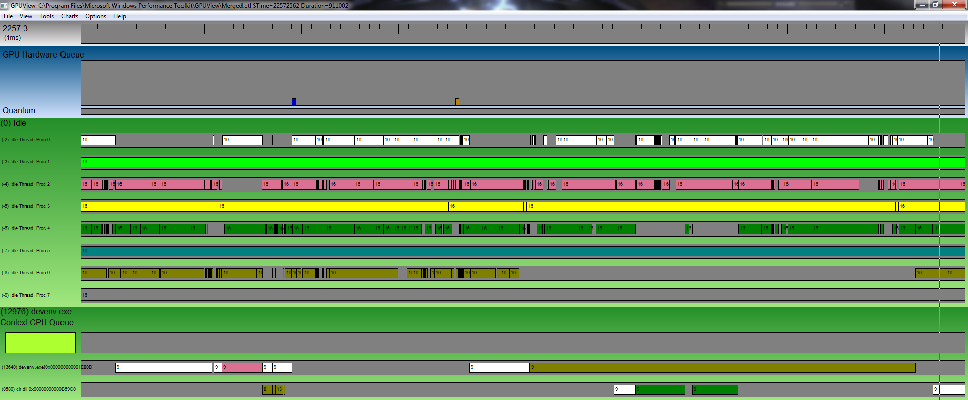 The horizontal axis in GPUView is always time. The timescale of the smallest tick mark on the "ruler" at the top of the screen is given in the upper left. Just below that is the GPU Hardware Queue, which shows what work is currently being processed by the graphics card (largely empty for this trace.) Below the hardware queue is a green rectangle for each process in the system. Within each process, the CPU graphics queue is shown first followed by each thread that belongs to the process. Because there are a lot of threads on the system, GPUView will hide threads and processes that do not appear to be doing a lot of work. The first process shown is always the idle process with a thread for each core on the CPU. At every time interval, each the cores will be working on exactly one thread (if there is no thread with work ready the processor will be in its idle thread.) Each processor is given its own color, so it is easy to see which processor is working on which thread at any time. Processors can context switch between threads for a large number of reasons, such as the thread's execution quantum expires, the thread went to sleep or is blocking on a certain event, or a higher priority thread has work ready.