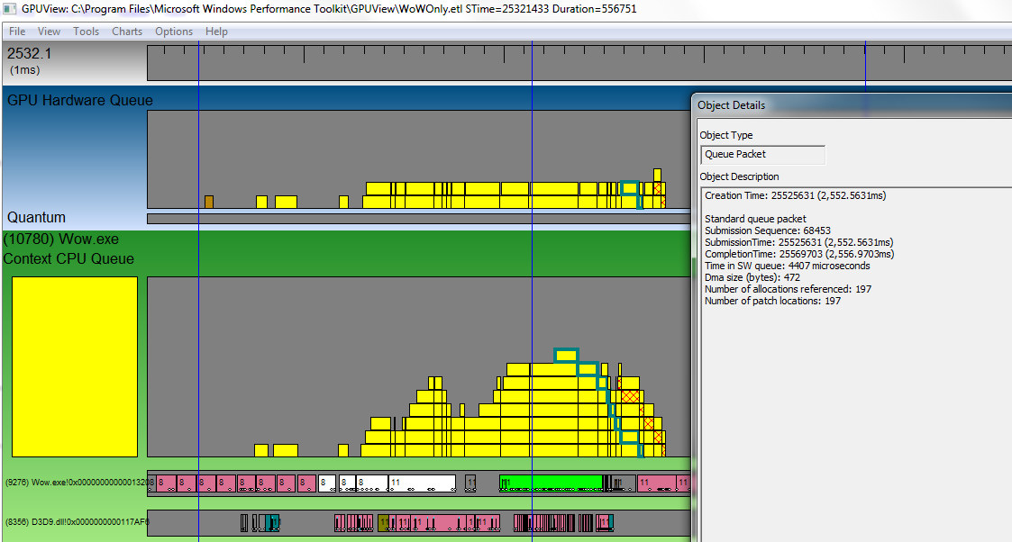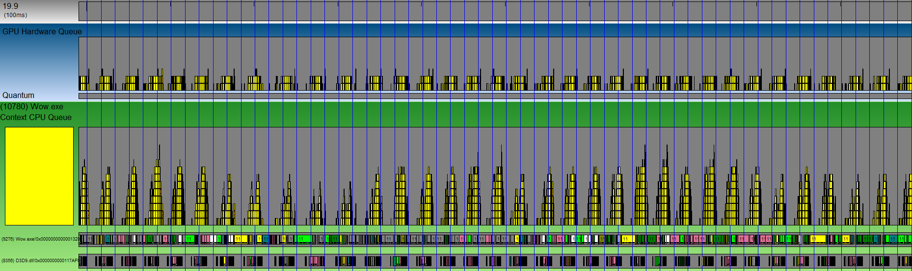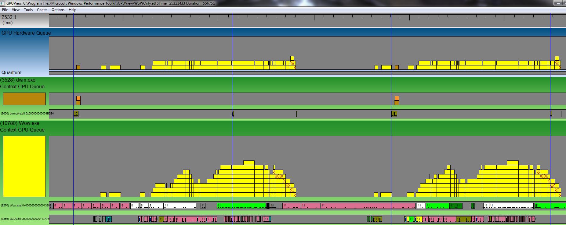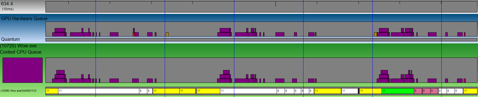 Although only one World of Warcraft thread is shown here, WoW in fact creates many threads and they are also executing some code during these intervals. However GPUView automatically hides them because they have almost no work, and the CPU thread shown above constitutes over 98% of the total execution time for WoW. You can look at this trace to see the execution pattern of the other threads in WoW. If any of these threads are designed to alleviate the workload of the main rendering thread, this trace suggests they are not doing a very good job.