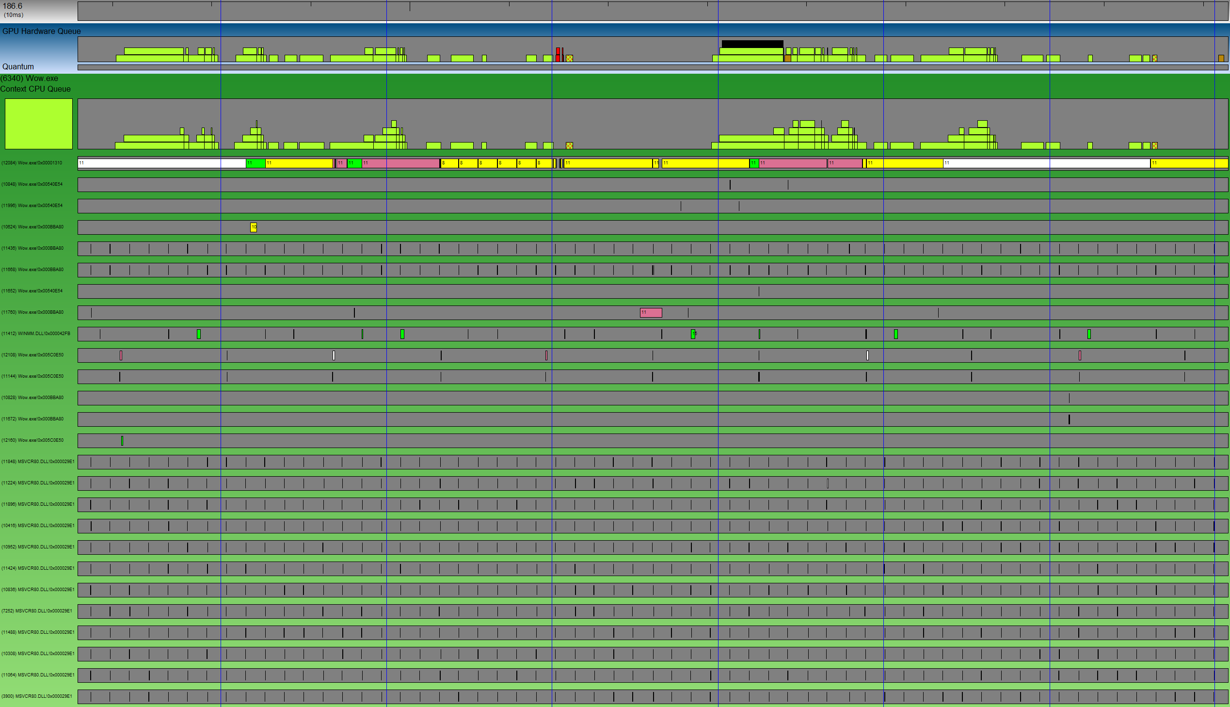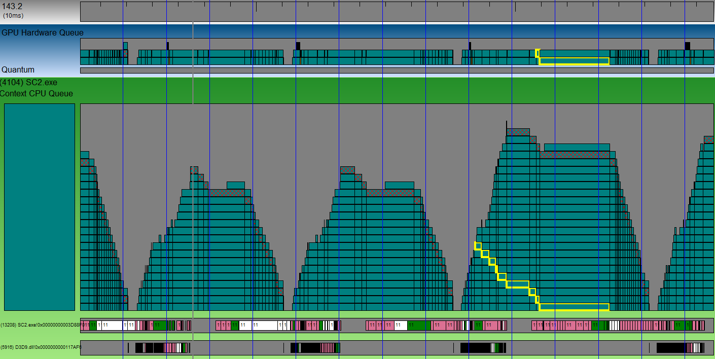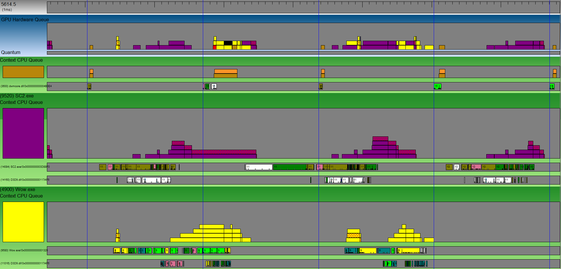 Although only one World of Warcraft thread is shown here, WoW in fact creates many threads and they are also executing some code during these intervals. However GPUView automatically hides them because they have almost no work, and the CPU thread shown above constitutes over 98% of the total execution time for WoW. You can look at this trace to see the execution pattern of the other threads in WoW. If any of these threads are designed to alleviate the workload of the main rendering thread, this trace suggests they are not doing a very good job.