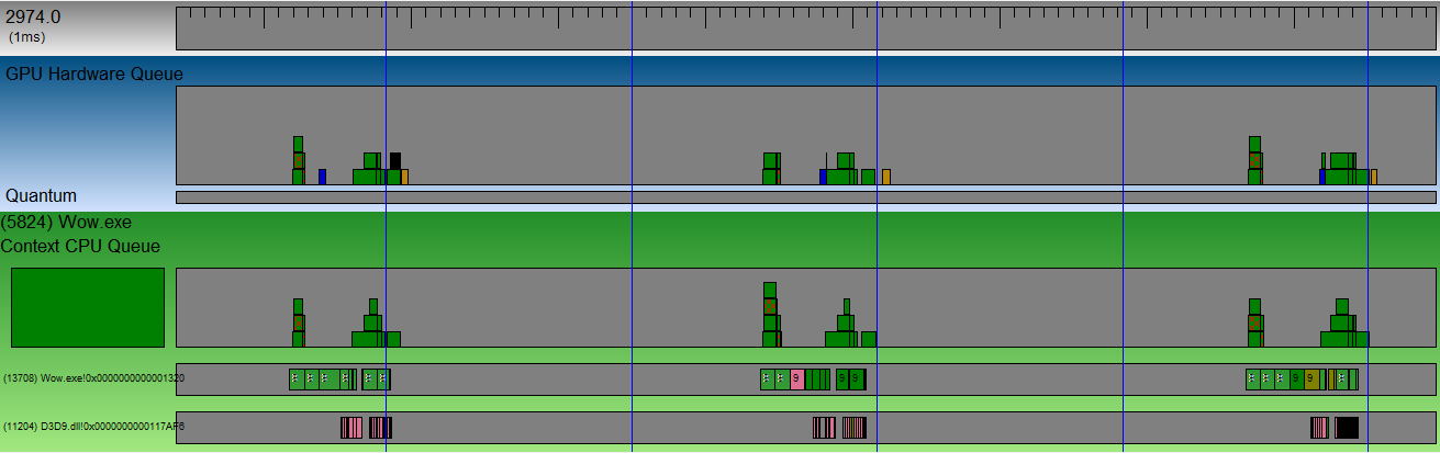 Throughout the interval shown above, WoW's main thread continuously submits work to WoW's CPU queue, and then the operating system uploads work from the CPU queue onto the GPU queue. To see the queue behavior better, below we zoom into approximately three VSync intervals: