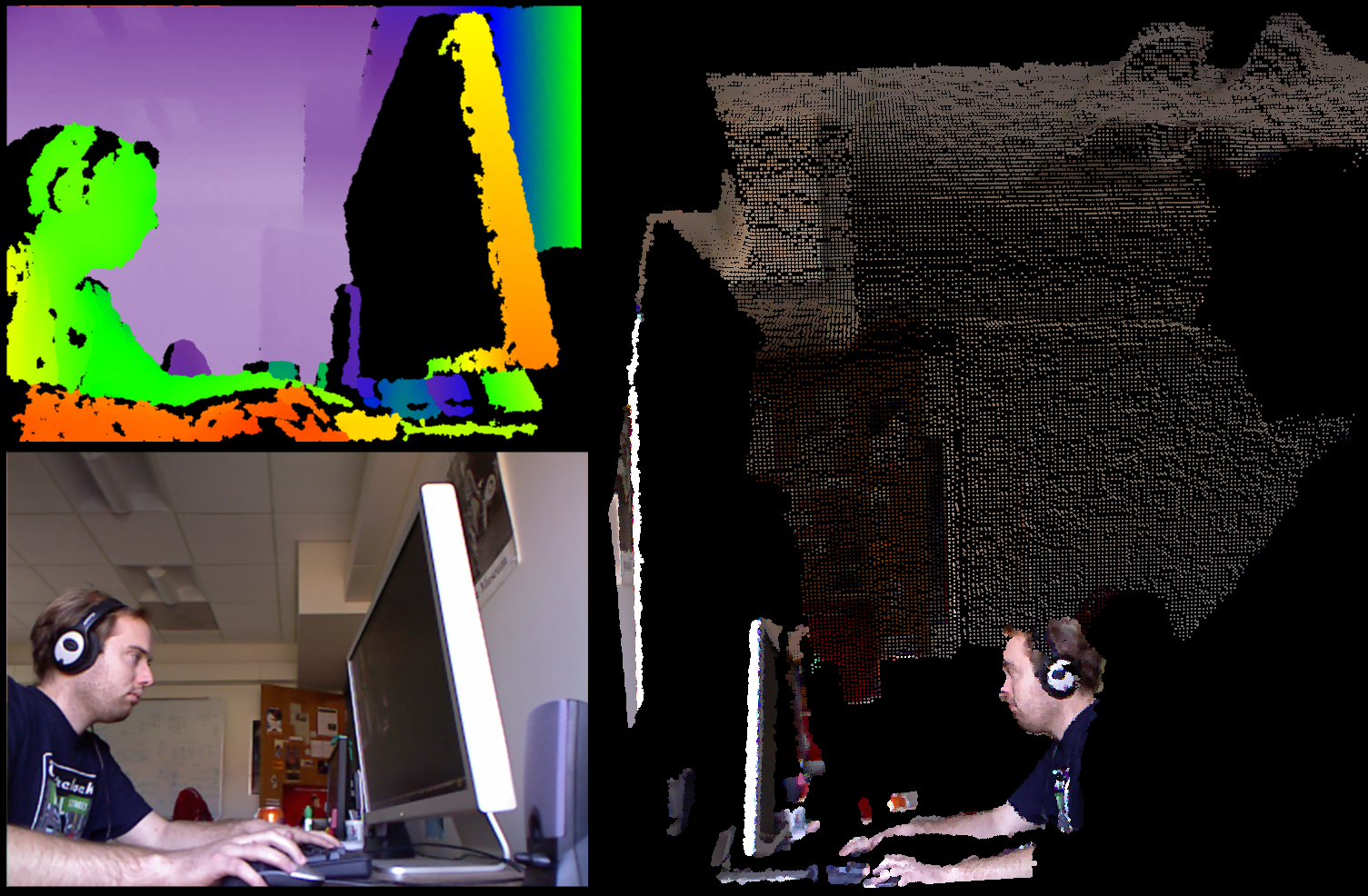 Once you have calibrated the depth and color sensors, you can pretty easily make a colored mesh of the 3D environment, which is very useful when writing and debugging applications that use the Kinect. Because generating a 3D mesh requires choosing arbitrary cutoff factors to determine which edges correspond to depth discontinuities, I instead use a simpler point cloud approach where I render a colored set of spheres.