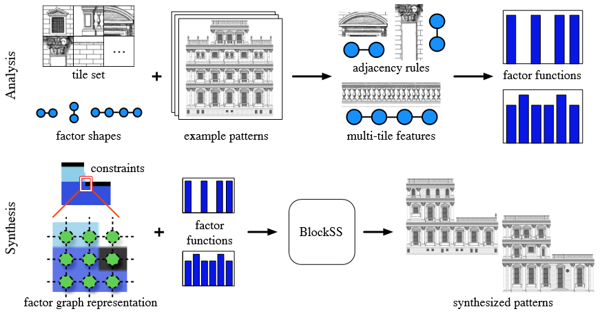 Patterns with pleasing structure are common in art, video games, and virtual worlds. We describe a method for synthesizing new patterns of tiles on a regular grid that are similar in appearance to a set of example patterns. Exemplars are used both to specify valid tile arrangements and to emphasize multi-tile structures. We model a pattern as a probabilistic graphical model called a factor graph. Factors represent the hard logical constraints between tiles, the soft statistical relationships that determine style, and the local dependencies between tiles at neighboring sites. We describe a simple method for learning factor functions from a small exemplar. We then synthesize new patterns through a stochastic search method that is inspired by MC-SAT. Efficient synthesis is challenging because of the combination of hard and soft constraints. Our synthesis algorithm, called BLOCKSS, scales linearly with the number of tiles and the hardness of the problem. We use our technique to model building facades, cities, and decorative patterns.