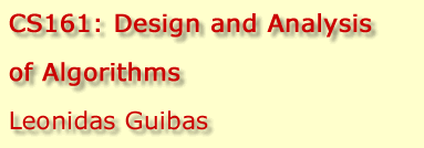 Professor Guibas' office hours for Tuesday, March 6, will be 2:30-3:30 pm in his office, not 1:30-2:30 pm. The class meets MW 3:00 -- 4:20 pm in the NVIDIA Auditorium. There are six recitation sections -- details here. The lectures are recorded and are available through SCPD to qualified viewers. Recitation F is now (from 1/26) Friday, 4:30 -- 5:20 pm in Thornton 102 (and broadcast via SCPD) Be sure to read the CS161 homework policies. CS161 covers in depth fundamental data structures and techniques for discrete algorithm design and analysis. Specific topics to be covered include: