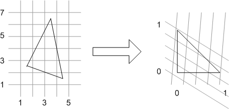 Greetings! My name is John Owens and I have a graphics algorithm problem. This web page is a little long, but I hope it fully describes the problem. The problem is pretty simple. I would like an efficient routine which takes a screen-space triangle, with vertices at arbitrary floating-point values, as input and emits all the integer screen-space grid points covered by that triangle. Here's an example: