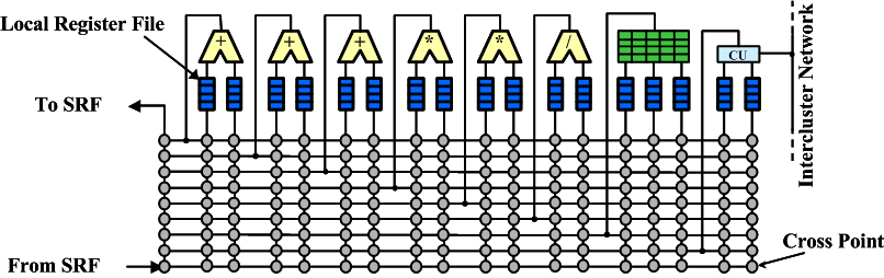 Each of the 8 clusters has 3 adders (which do both integer and floating-point adds, subtracts, and logical ops); 2 multipliers (both integer and floating point); and a divide/square root unit (both an integer and floating-point divide). There's also a scratchpad register file (256 entries - used for local array lookups) and a communication unit used for sending and receiving values to other clusters. Except for the divide/square root unit, each of these functional units is fully pipelined and can issue one operation per cycle.